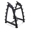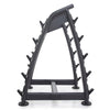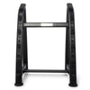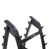 The Denali Series Fixed Dumbbell Rack stores our ProStyle Round Rubber Fixed Barbells with a clean, open, and organized look. Barbells are positioned at an angle, securely held on slanted PVC posts, making each barbell weight easier to see and grab and return. 39" L x 51" H x 33.5" W. Black, powder coated steel. Barbells not included.