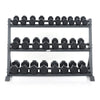 Granite Horizontal Dumbbell Rack is part of the durable, hard-working Granite Series for budget conscious gyms. The rack holds 10 to 20 pairs of dumbbells, with a lip to keep dumbbells safe and secure. The durable, powder coated steel is 3 x 3 11-gauge, and sturdy enough for your heaviest weights. 68.5” W x 40” H x 25” D. 150 lbs. Dumbbells not included.