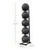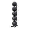 Great solution for a studio or small space. Holds up to five standard size medicine balls, like our Elite Power Med Ball Prime Gray. Molded plastic feet on bottom to provide stability and protect floors. Black painted steel. Assembly required. Balls sold separately. 14" L x 11" W x 52" H. Kits available. Larger racks available.