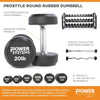 BRAND NEW! Durable construction that is ideal in frequent-use settings! The heads of our ProStyle Round Rubber Dumbbells are cast metal are encased in thick rubber to prevent damage to the weights, floors and other equipment in the exercise facility. Ergonomic, knurled chrome handles provide a comfortable, stable grip. The rubber heads have a slight bevel, and are welded directly to the handle. Weights are clearly marked in white, making it easy to grab the correct size. Twenty weights available, from 5 to 100 lbs. Sold in pairs. Rack available.